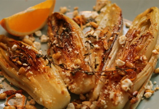 Braised Endives with Orange Juice, Pine Nuts and Ricotta Salata